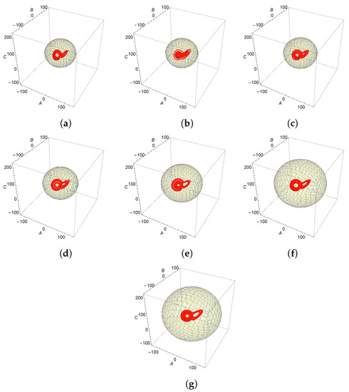 We now show that there is a bounded ellipsoid, E, within which all trajectories of the generalized Lorenz system (67)–(69) remain. In order to show this aspect, we multiply Equations (67)–(69) by A, B, and , respectively, where . Adding the resultant equations and rearranging them, we obtain