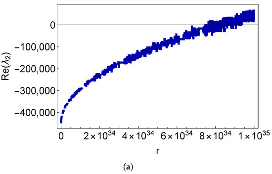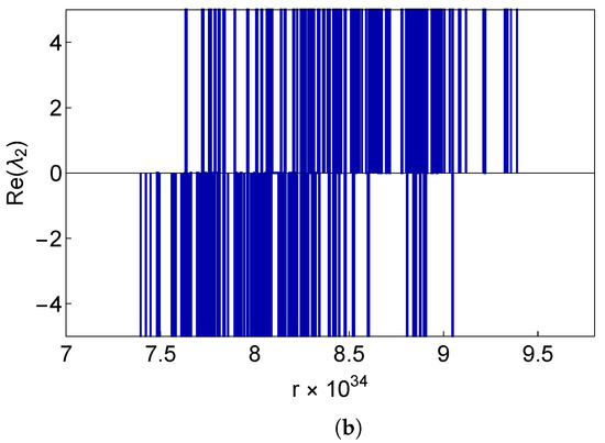 As in the case of the classical Lorenz model [42], in the generalized Lorenz model, one can also find a trapping region within which the trajectories remain (seen in Figure 3). This trapping region is an ellipsoid, as shown in Equation (73), and its volume depends on the boundary combination, as shown in Figure 6. Figure 7 is a justification for not considering the physically unrealistic boundary combinations of both boundaries as adiabatic. We have plotted the real part of the largest eigenvalue, , in the Lyapunov spectrum against r for the representative boundary combinations of . The figure clearly indicates the blowing up of Re() with r, thereby implying that this boundary combination is not viable. A similar observation holds good for and .