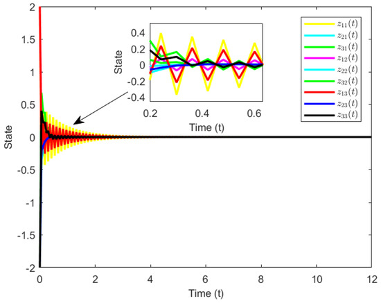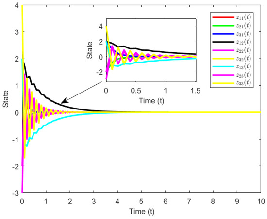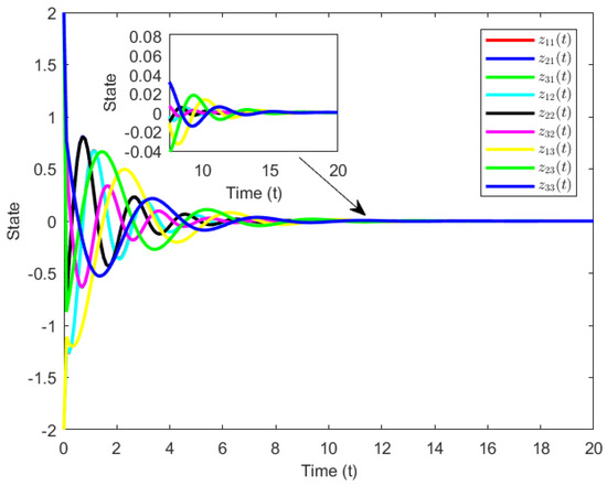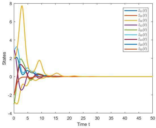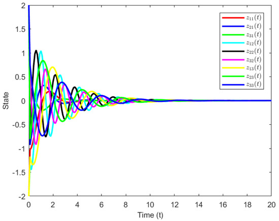 In Figure 7, said CDNs under linear controller (39) and (2) have been implemented as ESy. Meanwhile, Figure 7 shows CDN (39) and (2) under the linear controller . Because both the time delays and the strength of random disturbances are smaller than the bound derived from Theorem 3, error system (81) is stable. Therefore, CDNs (39) and (2) are MSESy and ASESy. In addition, Figure 8 shows the state of the system (81) without delay and random perturbations under a nonlinear controller.