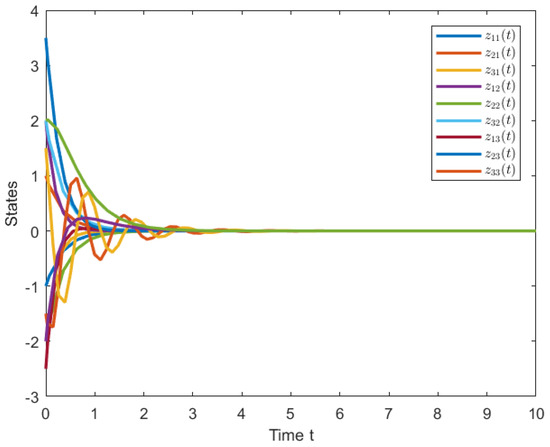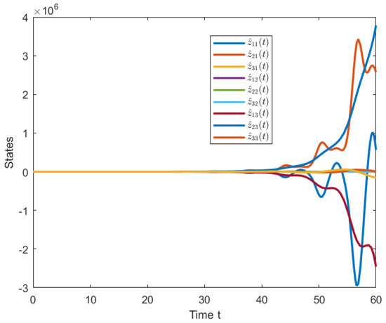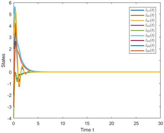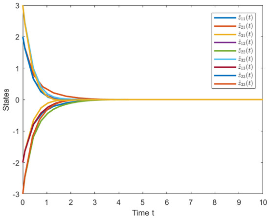 In Figure 10 shows the state of CDN (39) and (2) under nonlinear controller , . In addition, Figure 11 shows the state of the system (88) without delay and random perturbations under a nonlinear controller. Because both the time delays and the strength of random disturbances are smaller than the bound derived from Theorem 3. Hence, error system (88) is stable and error system (87) is stable, Therefore, CDNs (39) and (2) are MSESy and ASESy under the nonlinear controller.