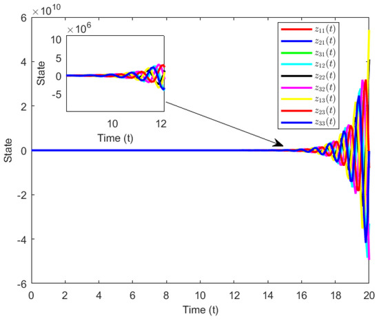 In Figure 9 describes the state of time delays and excessive noise intensity, i.e., . It is easy to obtain that the limits of the time delays and noise intensity are greater than the theoretical results derived from Theorem 3. Therefore, error system (82) is unstable, that is, error system (81) is unstable, so CDNs (39) and (2) are not ESy.