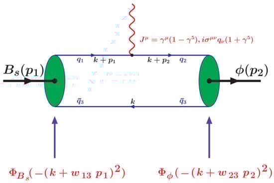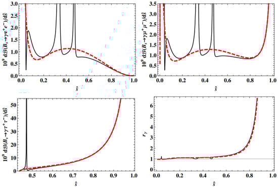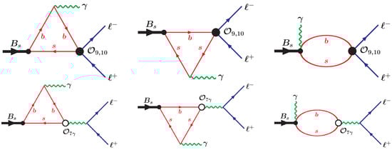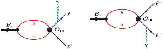 where and is the EM field tensor. In (26), the dilepton is produced from the weak b–s transition (Figure 2); in (27), the weak transition gives birth to a real photon (Figure 3). An additional set of diagrams depicted in Figure 4 is considered too, where the real photon is emitted as the final-state radiation (FSR).