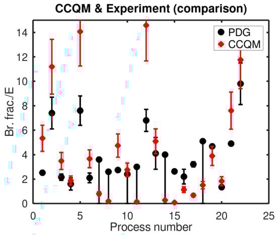 Before reviewing other CCQM results on leptonic B decays, we present, in more detail, the evaluation of the branching fraction for []. The computations are, in many ways, similar to those of other cases and provide an insight into how leptonic and radiative decays are treated within the CCQM. Since is the only hadron, one needs to extend the set of parameters (5) by only one number, i.e., , which was settled in previous works. The values of the remaining parameters are identical to (5) (see Equation (8) in []). Two explicit forms of the effective Hamiltonian (1) are considered: