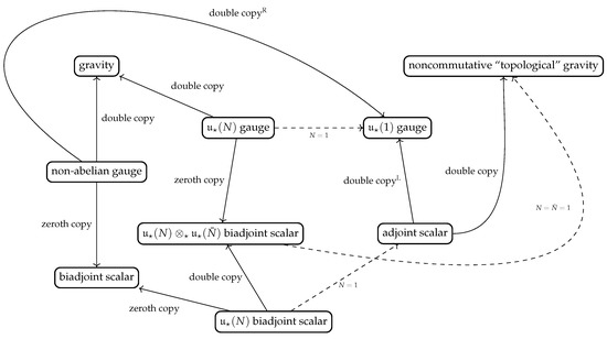 The different commutative and noncommutative field theories encountered in this paper, and the relations between them. Dashed lines relate theories through rank-one specialisations of colour algebra, while solid lines relate theories through double or zeroth-copy operations. double copy operations without superscripts indicate a double copy of a theory with itself, while those with superscripts indicate the double copy of a “left” theory with a “right” theory.
