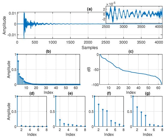 (a) Acoustic impulse response of length (its tail is magnified in the top-right of the subfigure); (b) Singular values of the corresponding matrix of size , with ; (c) Singular values from subfigure (b) at logarithmic scale; (d–g) Singular values of the corresponding matrix (of size ) associated to the impulse response , for , , , and , respectively.