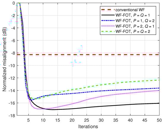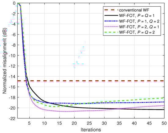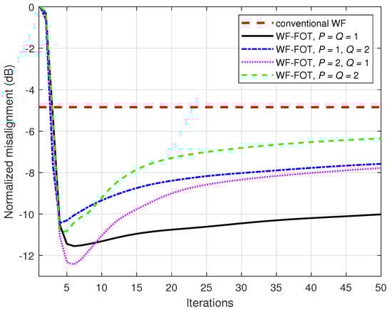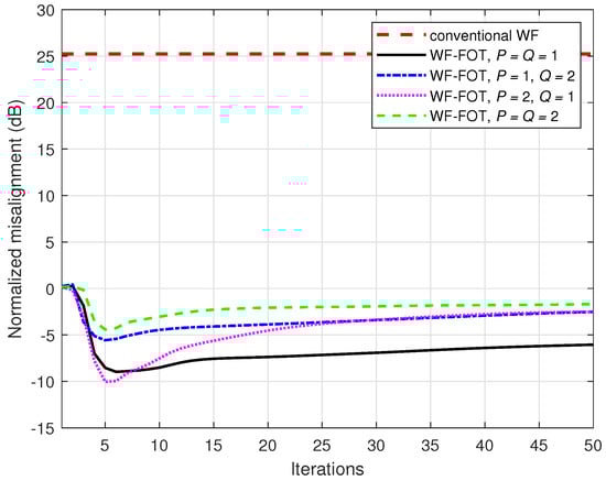 Normalized misalignment of the conventional WF and WF-FOT (with different values of P and Q). The statistics are estimated based on data samples (with ) and dB.