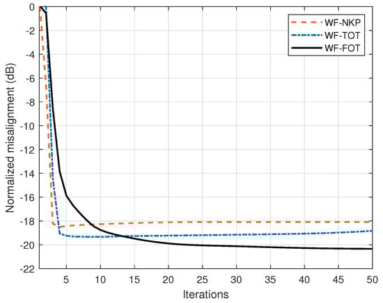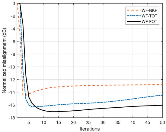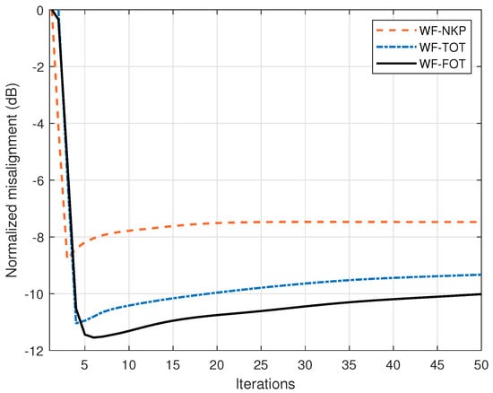 The SNR is also an important factor that influences the accuracy of the Wiener solution. This aspect is supported in Figure 5, where a sufficient amount of data is available (i.e., ), but dB. The noisy conditions considered in this simulation lead to higher misalignment levels for all the algorithms. Nevertheless, the proposed WF-FOT still outperforms its conventional counterpart, especially for the case when , which is also advantageous in terms of the parameter space (i.e., the lowest number of coefficients to be estimated).