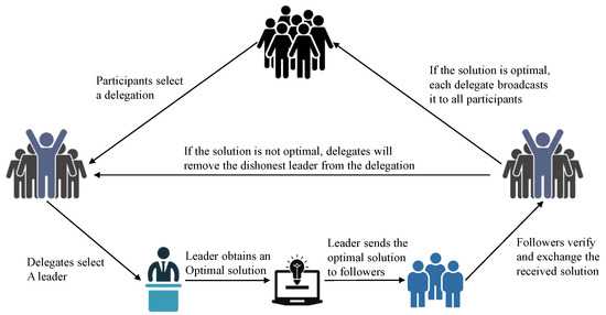 As shown in Figure 2, in a PoSo scenario, all participants select a delegation of participants interested in managing the collaborative network. An interim leader, elected by the delegates, is charged with coming up with the best solution. The other delegates are followers who validate and exchange the solutions they receive. If followers agree on a solution, they broadcast the solution to every participant. Participants trust a solution if it is approved by a majority of delegates. Any leader who is deemed incompetent or dishonest will be removed from the delegation and replaced by another representative.