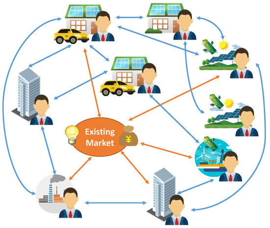 An illustration of P2P energy markets is shown in Figure 3 [36]. Prosumers will negotiate the simultaneous price and energy for multi-lateral transactions based on predefined trading rules. It can be seen that the P2P energy market is much more decentralized compared to the existing centralized market, where all participants must provide and share all private information (such as cost or utility functions, power boundaries, and generation uncertainty) to a central coordinator, who centrally determines energy dispatches. In a P2P market, all agents are free to negotiate prices and quantities for multilateral transactions without leaking any private information.