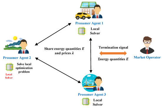 In this section, a decentralized negotiation mechanism based on consensus ADMM is proposed for P2P energy trading, which is shown in Figure 4. Agents will solve individual optimization problems to determine the optimal biddings, and then communicate and share the updated energy quantities and prices to neighbor trading agents. The negotiation process will run iteratively until convergence, which is decided by the Market Operator (MO). The MO collects updated transaction information and sends a termination signal after the balance between each pair of agents is met. The proposed negotiation mechanism focuses on a deterministic clearing algorithm for a single time period of the previous day, and it can be easily extended to multiple time periods [15,16].