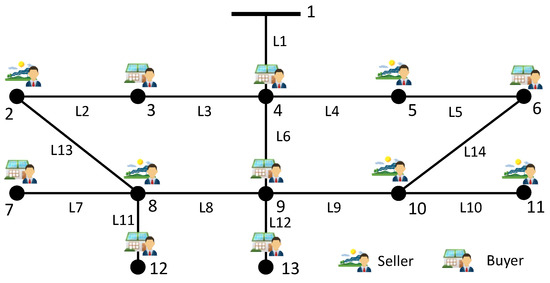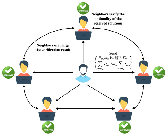 If the cumulative KKT conditions (19) are met, the optimality of the solution is also successfully verified, and results are exchanged among other neighbor agents until the majority of them are approved. An incentive and punishment mechanism is also designed. In detail, if the verification fails, the dishonest agent n will be subject to a heavy fine, which is expressed as adding a penalty indicator function in the objective function. If the result is optimal, ; on the contrary, . Here, P is a predefined penalty that will be distributed equally among all verifiers who participate in the consensus process. This new consensus mechanism can motivate agents to participate honestly in the energy market and achieve an incentive compatible market. An illustrative example is shown in the Figure 5, and the consensus mechanism is summarized in Algorithm 1.