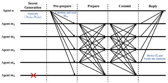 and sends them to corresponding neighboring agents; then, in the Prepare phase, each agent m will broadcast to all agents in ; after that, in the Commit phase, when receiving from no less than agents, each agent send a Commit message to others; finally, in the Reply phase, when receiving Commit messages from no less than agents (including itself), agent m derives the correct aggregated result by executing Algorithm 3. In short, the agent enumerates all possible decryption results, and most of these possible results are considered correct.
