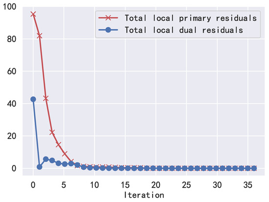 Local Update for Market Operator: Since is strictly convex, it suffices to guarantee that our algorithm converges to the global optimum point [37]. The algorithm converges when the total primary residuals (the squared difference between each pair of traded amount) and total dual residuals (the squared difference between the amount of two successive iterations) is smaller than the global stopping criterion as follows: