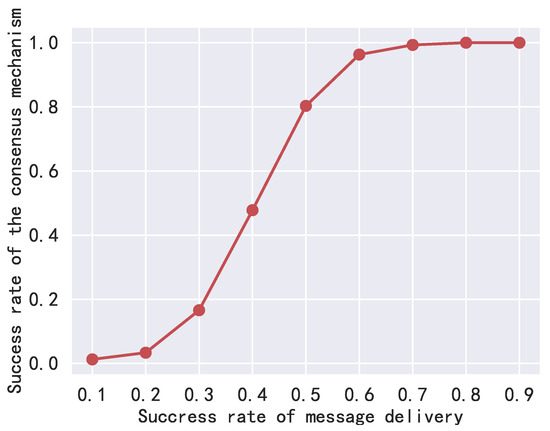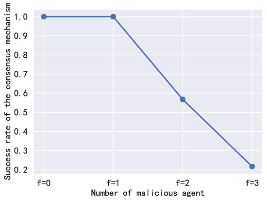 Then, we assume that there are malicious agents who will manipulate the shared information to make the recovery value wrong. To be specific, the malicious agents will add a random value to the , and broadcast it to other neighboring agents during the consensus process. Table 4 shows the recovery results set of a trusted agent with and without malicious attack. It can be seen from the table that, under one malicious agent attack, the major result in is still the right result. However, if there are two malicious agents in the neighboring agents’ set, one trusted agent may receive two fake messages from the two malicious agents, then in the six () recovery results, there will be five wrong results, and it is impossible to obtain the right result from the recovery set as shown in the third column in Table 4. Therefore, if the proportion of untrusted agents satisfy , the proposed method guarantees the correctness of the consensus verification results. Figure 11 shows the success rate of the consensus mechanism under different numbers of malicious agents. With the increase in malicious agents, the success rate decreases quite fast. When , i.e., there are three malicious agents in the neighboring agents, the success rate is only about 20%.