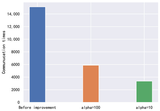 The computational efficiency improvement for the consensus mechanism is shown in Figure 12. We use the communication times among agents to measure the performance. It can be seen that after taking the strategy, i.e., only verify the optimality of the received results for the first three and last few iterations, the communication times among agents can be highly reduced by more than 60%, from 15,120 to 5880 () and 3360 ().