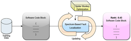 The conventional spectrum-based fault localization is finetuned using the Spider Monkey Optimization algorithm for a better-refined ranking model. The more precisely the rank assigned to the code blocks, the better the accuracy of the fault forecasting model would be. The spectrum-based fault localization model employs a mathematical formula that is specific to the method to assign a potential vulnerability ranking and possible fault to each trace of program components, such as expressions, code statements, initialization statements, assignment statements, branching statements, and evaluation statements, that are gathered for each test case. The suspiciousness rank is a metric used to assess the probability of a statement or a code snippet within a software program being faulty. By employing a spectrum-based approach for fault localization, the dependency information of each code snippet is scrutinized during the execution of test cases. The suspicious code block assessment estimates suspicious ranks for each program element by integrating correlation and dependency information [28]. The fine-tuned spectrum-based fault localization framework is shown in Figure 2.