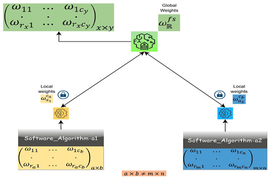 From the above equations, the notation is used to update the weights when the clients’ matrices have similar dimensions, and denotes the weights when the matrices have divergent dimensions.