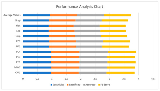 The above tables show the proposed model’s performance in relation to individual programs and the overall performance of the proposed model in executing over a standalone environment and a federated learning environment. It can be seen from the experimental results that standalone learning has exhibited better performance than federated learning. Their performances in federated learning are comparatively lower due to the standard features among the programs that have different feature ranks among divergent program categories that would result in compromised accuracies in the global model. The performances for each program class are evaluated against the existing models, and the performances of each program category are evaluated as shown in Table 13. PC4 of the NASA-MDP repository has attained the highest accuracy of 97.9%, and Sed of the Unix Utility program has the least accuracy of 89%. The mean accuracy for all categories of programs is 93.7%. The graphs representing the resultant outcome for all programs are shown in Figure 4.