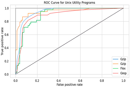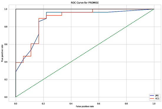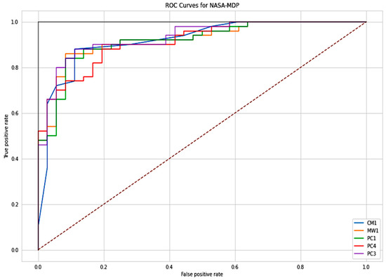From the above equation, the notation designates the number of positive samples, and the notation designates the number of negative samples in the entire dataset. The corresponding ROC curves for NASA-MDP programs are shown in Figure 5, the ROC curves for PROMISE programs are shown in Figure 6, and the ROC curves for Unix Utility programs are shown in Figure 7.