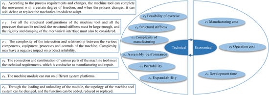 According to the product characteristics and design requirements of the machine tool chipremoval system, the evaluation index system of the product conceptual design scheme is established, and these indexes are divided into two categories: technical and economic. The refined indexes are appropriately deleted, added, and merged, and the nine evaluation indexes of this paper are determined. e1–e6 is the technical evaluation index, e7–e9 is the economic evaluation index, and the detailed indexes and evaluation criteria are shown in Figure 3.