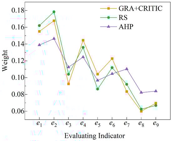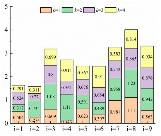 According to Equations (16)–(20) and the subjective and objective weight of the evaluation index, the combination coefficient is calculated as . The comprehensive weight of each evaluation index is ωj = {0.1551, 0.1678, 0.0925, 0.1446, 0.1042, 0.1227, 0.0835, 0.0600, 0.0696}.
