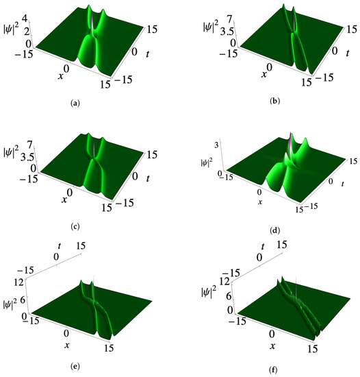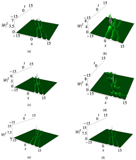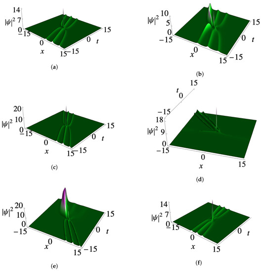 Figure 4a–f present the condensate profiles of third-order smooth positons with a kink-like nonlinearity-modulated function . By considering the initial parameters , , , and , an appropriate third-order positon profile is formed within the condensate density background, as shown in Figure 4a. Notably, a decrease in leads to a sudden rise in one of the subcrests, as demonstrated in Figure 4b for . Furthermore, Figure 4c illustrates an increase in amplitude when changing the value of to . On the other hand, in Figure 4d, when the parameter is increased to , the positon tends to disappear within the condensate profile when . Interestingly, a reverse scenario occurs when , resulting in a higher peak in one of the profiles and an increased amplitude, as depicted in Figure 4e. Similarly, an increase in to yields a compressed three-positon profile with the same amplitude as Figure 4a, as shown in Figure 4f.