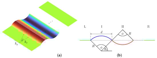 The cross section of each element consists of the curved surface perpendicular to the y axis (our quantization axis), which has the form of the direct arc of a circle (the concave surface) connected to the inverse arc (the convex surface) (see Figure 1). The first element is connected from the left side to a flat graphene sheet. Further, this structure (the first element) is repeated N times, and the last element is connected to the flat graphene sheet on the right side of our graphene structure. Hereafter, we consider a wide enough graphene sheet, keep the translational invariance along the y axis, and neglect the edge effects.
