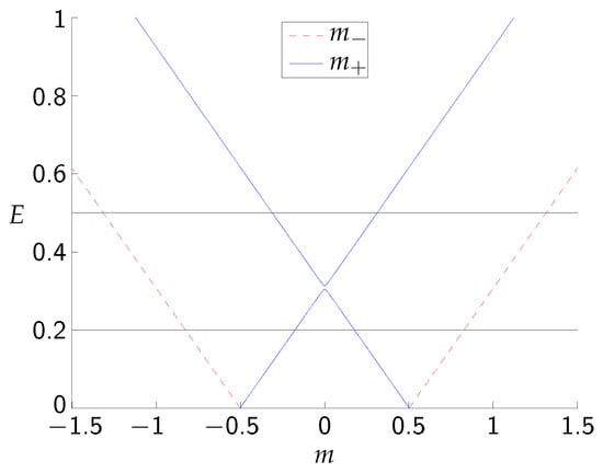 The energy spectrum (14) as a function of the magnetic quantum number m. For a given energy E, the magnetic quantum number values and are determined from the crossing points of the dashed and solid lines by the horizontal line (E), presented as an example. The results are obtained at Å, , . The values of spin–orbital strengths eV, eV (see Equation (10)) follow from the values of the parameters , , eV·Å, .