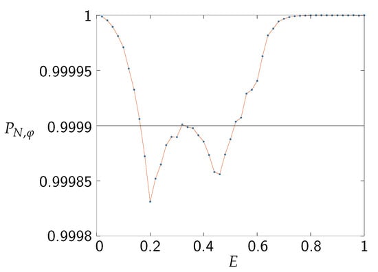 Evidently, the eigenvalues can be written in a very general form as , . Consequently, the amplitudes , () of Equation (40) become the functions of the eigenfunctions . It results in probabilities that will depend periodically on the number of units in superlattice through the functions , , .