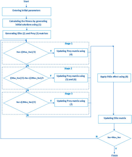 Marine predators have good memories. They remember places where they successfully hunted for foraging. This situation is simulated as a memory saving in MPA. After the prey is updated and the FADs effect is applied, the results are evaluated. Elite is updated if the results have better value. Thus, the solution quality increases. A flowchart showing the process in MPA is given in Figure 1.