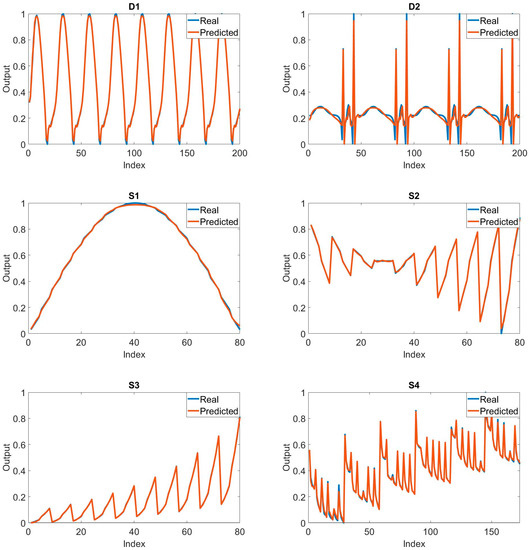 It is important to compare the real output and the predicted output in order to analyze the success status of the training process. In Figure 3, the comparison of the real output and the predicted output is shown for all systems. These graphs were created by taking into account the best results. In the graphs of D1, S1, S2, S3, and S4, it is seen that the real and the predicted outputs overlap exactly. In D2, the similarity rate of both outputs is very high. This is an indication of the success of the training process for the relevant systems.