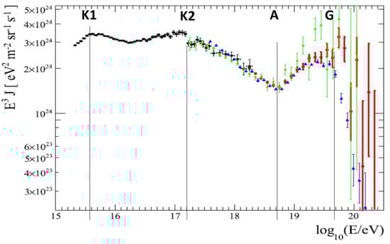 and these are just the energies labelled K1 and K2 where the two knees are observed when —see Figure 1. Data from other experiments yield slightly different values for the energies of the knees (not in perfect agreement with the predicted values), but the spectrum in Figure 1 is a particularly clean one, especially in terms of the abruptness of K1, K2, and A.