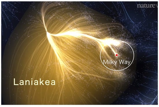 - Tully, R.B.; Courtois, H.; Hoffman, Y.; Pomerede, D. The Laniakea supercluster of galaxies. Nature 2014, 513, 71–73. [Google Scholar] [CrossRef]