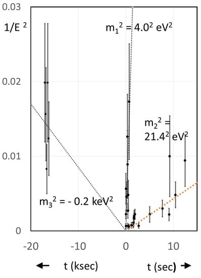 The model arose from a striking regularity observed in the SN 1987A neutrino data. Normally, it is assumed that the data can only be used to set an upper limit on the neutrino masses, not actual values. However if the supernova neutrino emissions are nearly simultaneous (to within 1 to 2 s), as Vissani and Rosso [31] have suggested, then from the spread in neutrino travel times and their energies we can compute the masses of neutrinos. Here, T is the light travel time from the supernova, t is the neutrino arrival time relative to a photon, and would apply to tachyonic neutrinos. To see how masses are computed for individual neutrinos, note that in a plot of versus neutrinos of a given mass will be found to lie on straight lines through the origin of slope [32].