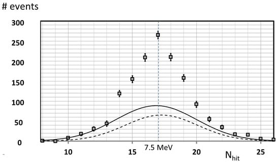 Further evidence for the existence of an 8 MeV neutrino line from SN 1987A was also published [29] based on the data in Kamiokande II by showing that the presumed background data recorded during eight 17 min time intervals on the day of SN 1987A actually consisted of an 8 MeV neutrino line sitting atop a background—see Figure 5. This claim by the author is obviously highly tenuous, given that the line comes right at the peak of the background, and its shape is not very different from that of the background. However, in defense of the existence of such an 8 MeV line, the height of the background can be deduced from events recorded by the detector in the months before and after SN 1987A, and also by fitting the background shape in Figure 5 to the data on the wings of the distribution away from the peak. In addition, recall that the 8 MeV neutrino line had been specifically predicted, and its observed width is exactly what would be expected, given the detector resolution.