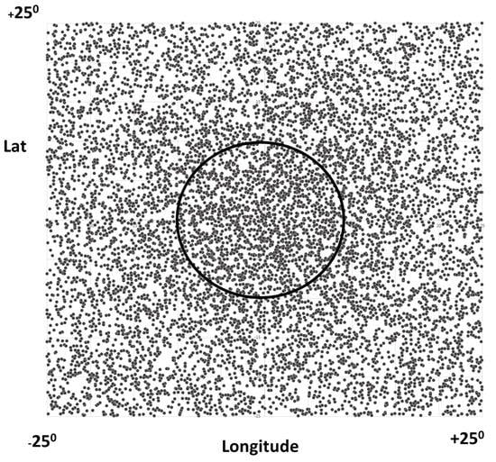 Image showing 1600 simulated signal events centered at (0, 0) with a directional resolution of 18 degrees and background events uniformly distributed in (Lat, Long). The excess above the constant background inside the circle is