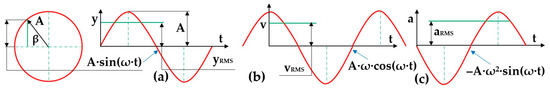 The effective value of deflection yRMS [m] [39] is the mean square value of the deflection A [m] per period, for the sine wave see (2), see Figure 1a. T [s] is a period that indicates the time t [s] of the duration for one repetition of this periodic process.