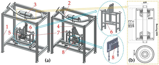 (a) Laboratory machine design, (b) conveyor roller. 1—steel frame, 2—firm conveyor idler, 3—conveyor roller, 4—V-belt, 5—drive electric motor, 6—drive support frame, 7—threaded guide rods, 8—supporting device of the electric motor.