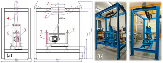 Laboratory machine (a) 2D structural design, (b) implemented solution. 1—steel frame, 2—firm conveyor idler, 3—conveyor roller, 4—V-belt, 5—drive electric motor, 6—drive support frame, 7—threaded guide rods, 8—supporting device of the electric motor.