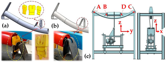 Placement of the conveyor roller axle in the support cut-out welded to the cross bar of the firm conveyor idler, (a) plastic roller holder, (b) plastic roller holder, (c) coordinate system and measuring points A–D. Sensor position A—left side, B—left middle side, C—right side, D—right middle side.