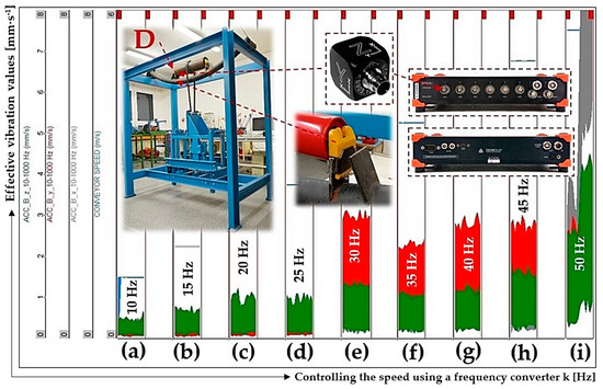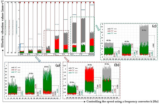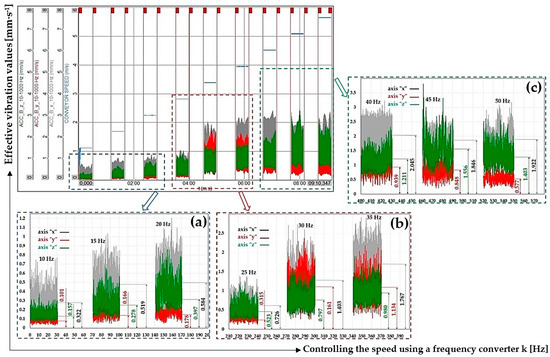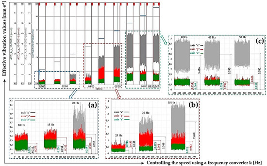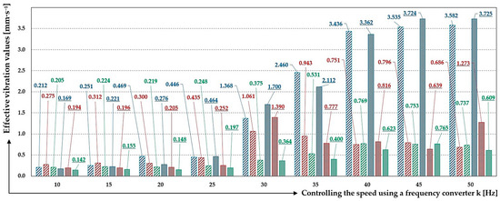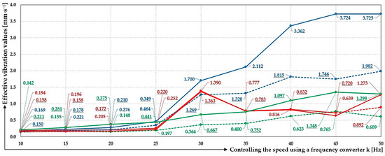 Effective values of vibration speed *RMS(k) [mm·s−1] (see Table 2) when controlling the speed of the electric motor using a frequency converter in the range of k = 25–35 Hz are listed in Figure 7c.