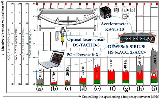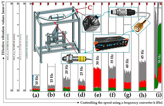 Table 5 shows the effective vibration values *RMS(k) [mm·s−1] that have been detected by a vibration sensor fixed in place j = A (see Figure 4c), by measuring apparatus SIRIUSi-HS in individual coordinate axes (* = x, or y, or z), see Figure 4a, on the cross bar of the firm conveyor idler, for variant—plastic support, when controlling the speed of the electric motor by a frequency converter in the range of k = 10–50 Hz.