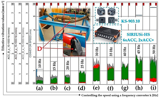 Table 4 shows the effective vibration values *RMS(k) [mm·s−1] that have been detected by a vibration sensor fixed in place j = D (see Figure 4c), by measuring apparatus SIRIUSi-HS in individual coordinate axes (* = x, or y, or z), see Figure 4b, on the cross bar of the firm conveyor idler, for variant—steel support, when controlling the speed of the electric motor by a frequency converter in the range of k = 10–50 Hz.