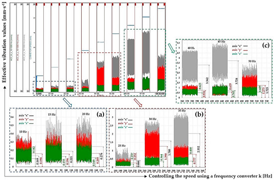 Effective values of vibration speed *RMS(k) [mm·s−1] (see Table 5) when controlling the speed of the electric motor using a frequency converter in the range of k = 25–35 Hz are listed in Figure 10c.