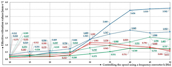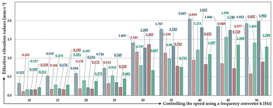 The maximum absolute values of the difference in effective vibrations values for the y-axis in point A (were achieved at the set frequency k = 50 Hz (on a frequency converter controlling the speed of the electric motor) ΔxRMS = 0.587 mm·s−1. The lowest absolute values of the difference in effective vibrations values for the y-axis in point A ΔxRMS = 0.065 mm·s−1 were achieved at the set frequency of k = 40 Hz.