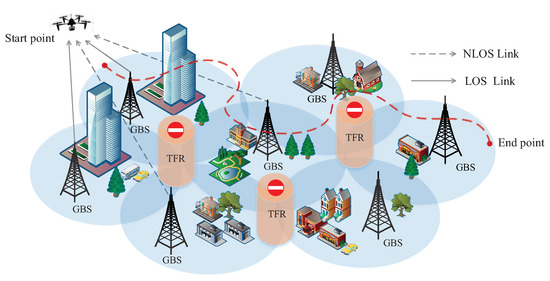 As shown in Figure 1, our study focuses on a cellular-connected UAV system that operates in an urban low-altitude airspace. Buildings in this area are densely distributed, and there are temporary flight restrictions (TFRs) and the deployment of several GBSs. The urban environment of interest is defined within a Cartesian coordinate system, denoted as . Here, D signifies the horizontal extent of the city, and H represents the city’s vertical extent. The maximum height of the building in the environment is represented by . In our system model, we define the GBS-UAV link based on the area and height of the building, following the recommendation of the International Telecommunication Union (ITU) [35].