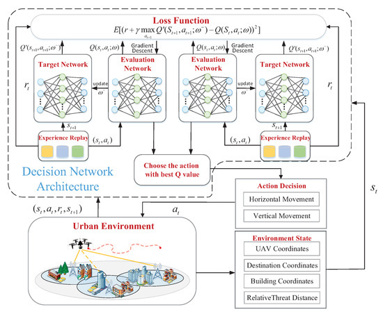 To better cope with static and unexpected obstacles in complex urban environments, we propose a collaborative offline and online strategy. In our proposed strategy, we incorporate two D3QN architectures, forming the comprehensive decision-making network framework, as shown in Figure 3. The long-term decision network, which processes static obstacle data and learns the corresponding flight strategy, is the first component of this dual structure. Secondly, the short-term decision network handles data related to unexpected obstacles, providing guidance for the UAV’s emergency collision avoidance. Within each discrete time step, the UAV identifies the presence of obstacles through its sensory apparatus. Upon detection of any obstacle information, the short-term policy network is activated, calculating the urgent obstacle information based on the current UAV position and consequently outputting the Q-value associated with the short-term policy decision network. Simultaneously, the long-term policy network generates the Q-value of the long-term decision network, informed by the end position, the current UAV location, and data on static structures. Subsequently, a comprehensive assessment of the Q-values from both decision networks is performed, and the decision yielding the maximum Q-value is selected as the recommended action for the current state. Finally, through continuous iterations, we generate the optimal collision-free flight path of UAVs within the coverage range of the GBS.