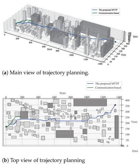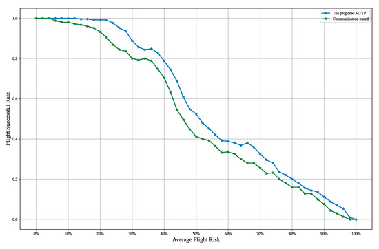 Figure 5 shows the simulation results of the flight’s successful rate changing with the average flight risk of the environment. The average flight risk of the environment is 0%, indicating that there are no static obstacles and sudden obstacles in the environment. The average flight risk of the environment is 100%, indicating that the environment is full of obstacles and even cannot fly. The blue line represents the MTTP, and the green line represents the communication-based trajectory planning solution [38]. The results indicate that the flight success rate decreases as the average flight risk of the environment increases, and the blue line consistently outperforms the green line. These results demonstrate that the MTTP method, compared to the communication-based trajectory planning solution [38], selects more suitable flight areas and increases the flight’s success rate by up to 10%, thereby enhancing the safety and reliability of the UAV flight.