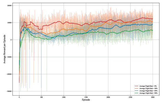 Figure 6 presents the average reward value of the proposed D3QN algorithm under various average flight risks. The results demonstrate that the reward value quickly converges and remains stable during the training process. Furthermore, lower average flight risks correspond to simpler UAV operating environments, resulting in higher reward values.