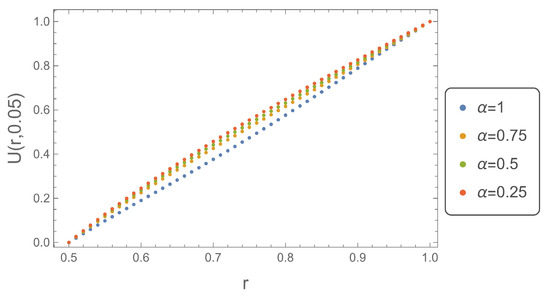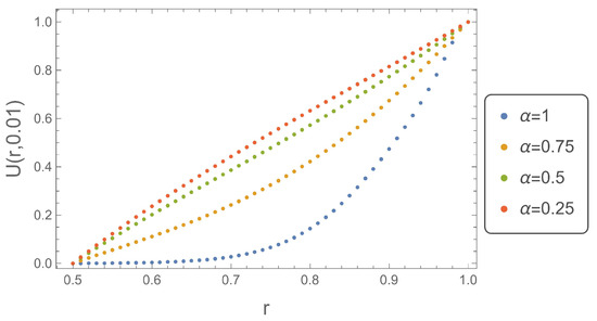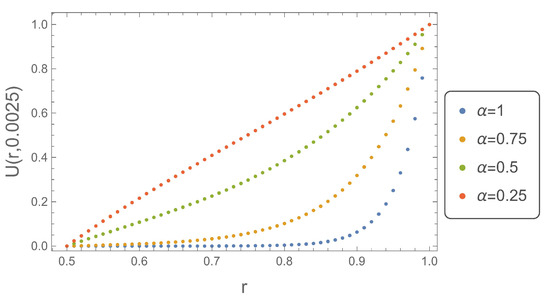 Figure 1, Figure 2, Figure 3 and Figure 4 show the solutions of the subdiffusion Equation (18) depending on the radius r at four different time instants. They clearly demonstrate the nature of the modeled phenomenon. For very early time instants just after the initiation of the process , the solution obtained for reaches the largest values. The disproportion between the solution for and decreases with the increase of time, and this results directly from the relation (1). Figure 4 shows that for , the solution obtained for takes the largest values.